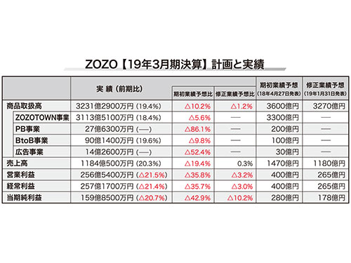 ZOZO(ゾゾ)の19年3月期における事業全体の商品取扱高は、前期比19.4%増の3231億円、営業利益は同21.5%減の256億円だった。プライベートブランド(PB=自主企画)事業の不振により、商品取扱高の計画未達、営業利益の減少につながった。ブランドの離脱につながった有料会員サービスは5月末で終了すると発表した。