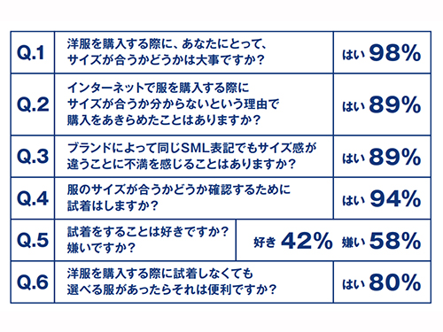 さらにユーザーアンケートで、「お気に入りのブランドの服があなたの理想のサイズで販売されていたら購入してみたいと思いますか?」という質問に対して、99%が「はい」と回答したという。