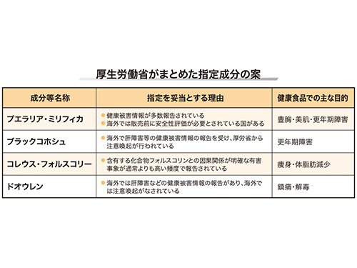 厚労省の薬事・食品衛生審議会が、特別の注意を要する成分としてまとめたのは、プエラリア・ミリフィカ、ブラックコホシュ、コレウス・フォルスコリー、ドオウレンの4成分だ。