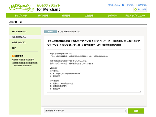 アフィリエイトサービス「もしもアフィリエイト」においてメッセージング機能を追加した。これまでは広告主とサイト運営者の間に、もしもが入り、コミュニケーションを図っていた。新機能では直接メッセージのやり取りができるため、迅速に意思疎通を図ることができる。