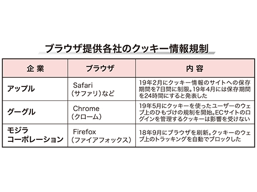 ウェブブラウザ各社がCookie(クッキー)情報の規制に乗り出している。規制によって端末情報の特定が難しくなり、リターゲティング広告の精度が大幅に下がる可能性がある。アップルは4月24日、ユーザー端末のクッキー情報がアクセスしたサイトに保存される期間を24時間にすると発表した。グーグルも5月7日、「Chrome(クローム)」の仕様についてクッキー情報保護に関する発表を行った。グーグル広告やヤフーの広告、フェイスブック広告など、デジタル広告の多くがクッキー情報を活用したリターゲティング(リタゲ)広告だ。リタゲ広告にクッキーを利用できなければ、広告による流入やCVが発生しづらくなる可能性がある。ウェブ接客やアクセス解析などのツールも大きな影響を受けるとみられる。クッキー制限の影響を受ける広告代理店の中には、動向を見守る姿勢を示す企業が多く、EC市場全体への影響は未知数だ。