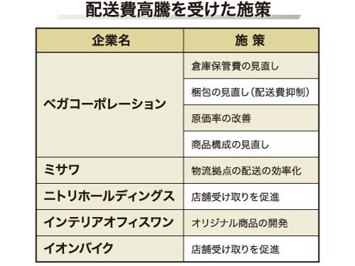 配送費の高騰は、営通販企業の営業利益にも深刻な影響を及ぼしている。大型商品の取り扱い企業にとってはなおさらだ。ベガコーポレーションは、19年3月期の営業利益が物流費の高騰の影響で3億円の赤字となった。インテリアオフィスワンも「物流費の上昇率は3~4%程度だが、会社に与えている影響はパーセンテージよりはるかに大きい」(店舗運営部・小川芳男課長)と話す。
