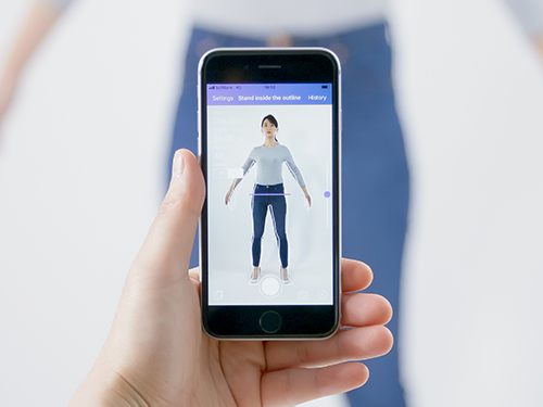 バーチャル試着機能はiOS向けスマホアプリのみで提供する。(1)身長(2)体重(3)性別(4)年齢─の四項目を入力し、全身が写った2枚の画像を撮影するだけで採寸可能。肩幅や首周りなど16カ所を採寸できるという。