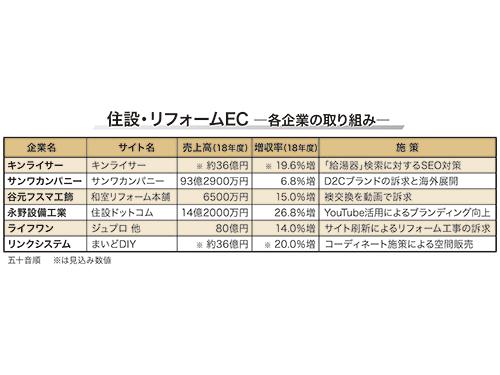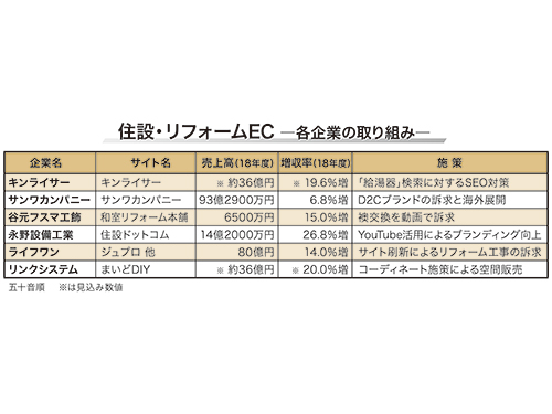 住設機器をECで販売する事業者の大幅な増収が目立っている。ライフワンの19年1月期の売上高は前期比14.0%増の80億円だった。リンクシステムの19年9月期の売上高は前期比20%増の36億円となる見通しだ。給湯器の交換工事を行うキンライサーの19年7月期の売上高は同19.6%増の36億円に着地する予定だという。ナショナルブランドの住設機器のECは差別化が難しく、価格勝負に陥りがちだ。激化する価格競争の中、工事とのセット販売の積極化や部屋全体の空間コーディネートの提案などでサービス面の他社との差別化を図る取り組みを続けてきた住設EC事業者が急成長を遂げているようだ。