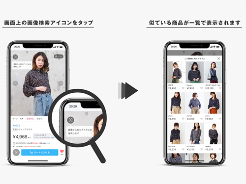 「類似アイテム検索機能」は商品画面上にある「画像検索アイコン」をタップするだけでAIが商品の形や質感、色、柄などを認識し、類似商品を表示する。数万人のユーザーを対象に行った先行テストでは、利用者は非利用者よりも滞在時間が4倍以上長くなったという。