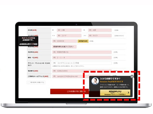 「ウェブ接客」機能では、新規ユーザーに「アマゾンペイ」の利用を促すことができる。ユーザーが配送先情報やクレジットカード情報を入力している途中で、「アマゾンペイ」の利用を提案するポップアップを表示すれば、煩雑な購入情報の入力を理由に離脱するユーザーを減らせる。