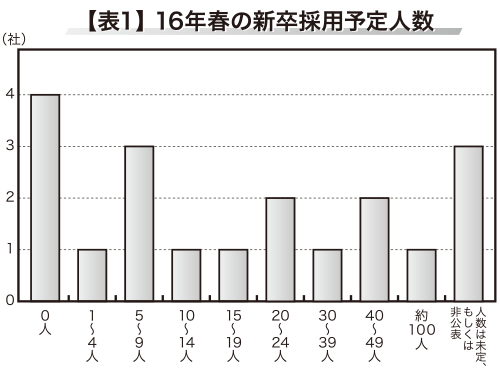 今春の新卒採用人数を前期より増やしたのは6社、減らしたのは4社だった。来春の新卒採用人数についてはばらつきがみられる(表1)。9社が今春よりも増加、3社が減少する予定と回答した。
