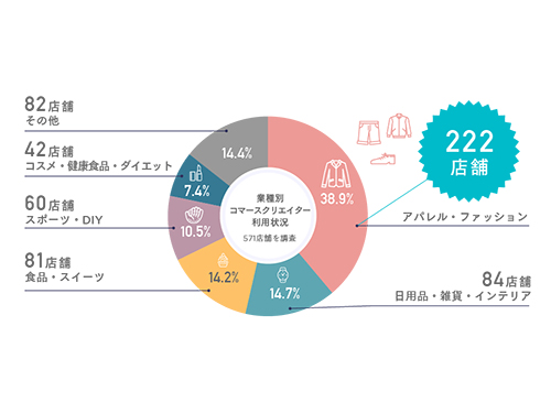 導入店舗の38.9%に当たる222店がアパレル・ファッションカテゴリーの販売店舗だった。日用品・雑貨・インテリアの取扱店舗は全体の14.7%、食品・スイーツの取扱店舗は全体の14.2%を占めた。