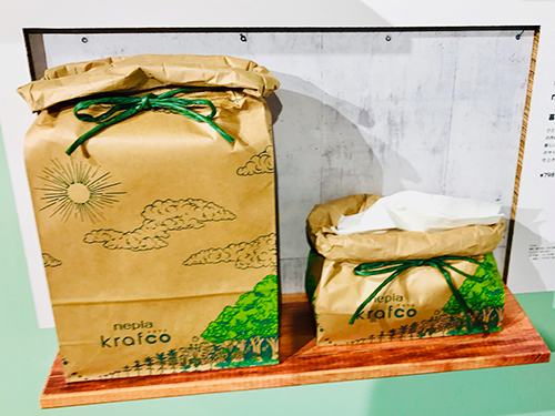 王子ネピアと共同開発した「nepia クラフコティシュ920W」は、5箱分のティシュをクラフト紙の紙袋に入れることで、紙箱や外装フィルムが不要になり、ゴミの量を約4分の1に削減できている。中身が減ったら、クラフト紙の端を外側に巻いて調整するデザインも秀逸だ。