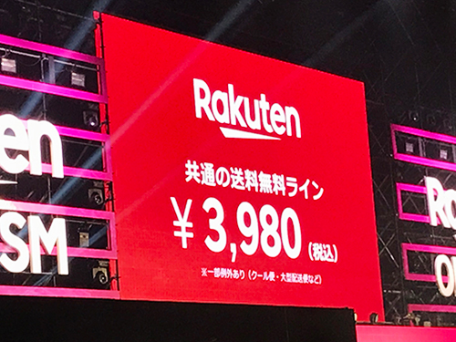 送料無料ラインとは、注文金額に応じて購入者の送料負担を0円にするサービスのこと。今年1月の新春カンファレンスで三木谷社長が「送料無料ラインを統一する」と発表し、8月に具体的な設定金額を「注文金額3980円以上」にすると発表した。