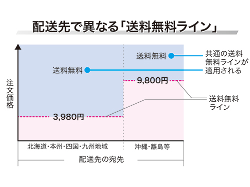 「実際に沖縄や離島などへの配送にかかるコストが、通常の配送料金と大きく異なることから社内で検討を進め、配送先が沖縄・離島の注文については、共通の送料無料ラインを『注文金額9800円(税込)以上』とすることにした」(楽天)と説明する。