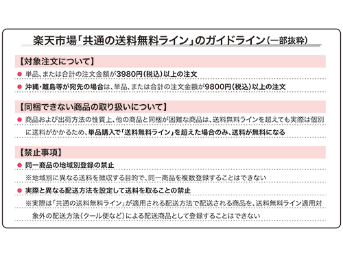 楽天は10月31日、来年2月以降に「楽天市場」で導入を予定している「共通の送料無料ライン」のガイドラインを制定した。今年8月の発表時には、配送先は全国どこでも送料無料ラインを「注文金額3980円以上」に設定する計画だった。しかし、出店者の声をもとに再検討し、沖縄・離島に配送する商品の送料無料ラインは、「注文金額9800円以上」に変更した。ガイドラインでは詳細なルールを紹介している。ガイドラインには違反店舗に対する罰則規定が記載されていないため、導入当初は違反店舗に罰則を科さず、猶予期間を設ける可能性もある。