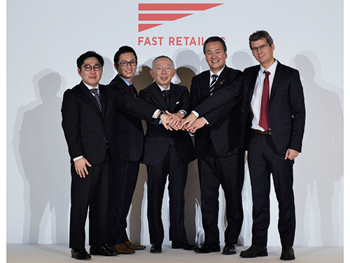 (写真左から)ファーストリテイリングの神保拓也グループ上席執行役員、MUJINの滝野一征CEO、ファーストリテイリングの柳井正社長、ダイフクの下代博社長、Exotec Solutions SASのロマン・ムーランCEO