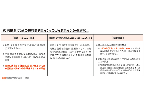 楽天は出店者に「共通の送料無料ライン」の規約ガイドラインを改定する案内を一斉送信した。出店者の任意で酒類は「共通の送料無料ライン」から除外できるようにした。