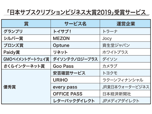 「日本サブスクリプションビジネス大賞2019」は、19年においてサブスク事業で躍進した企業を表彰する企画。100以上の応募サービスの中から、「グランプリ」など7賞11社を表彰した(表参照)。