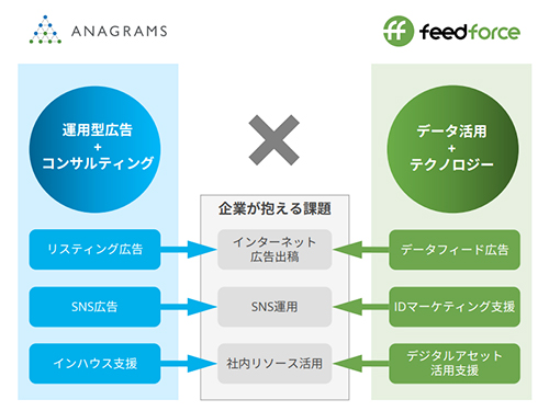 フィードフォースは商品データを生かした広告「データフィード広告」の運用支援を主に行っているが、アナグラムはネット検索に応じたテキスト広告「リスティング広告」の運用を主に支援している。