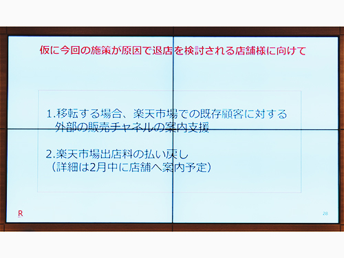 「送料込み施策」の導入により、やむを得ず「楽天市場」から退転する店鋪には、移転先となる販売サイトを既存客に案内できるようにしたり、出店料を払い戻したりする。詳細は2月中に店鋪へ案内する。