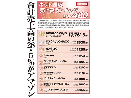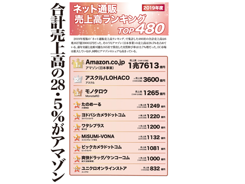 2019年度の「ネット通販売上高ランキング」で集計した480社の合計売上高は6兆1627億3900万円だった。そのうちアマゾン(日本事業)の売上高は28.5%を占めている。前年実績と比較可能な165社で算出した実質伸び率は12.7%増だった。EC市場は拡大しているが、同時にアマゾンのシェアも高まっている。