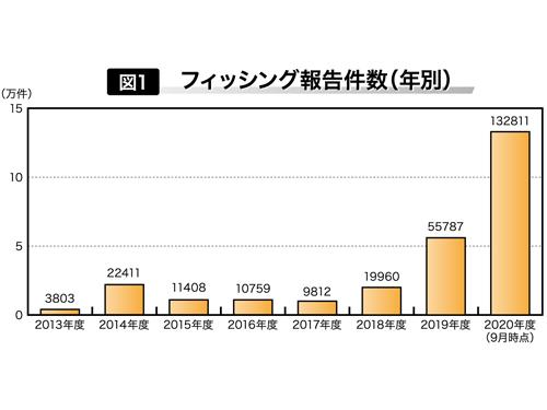 フィッシング対策協議会によると、フィッシング報告件数は20年9月時点で、前年より約7万7000件多い13万2811件となった(図1参照)。19年から20年にかけて、不正送金目的の被害が急増。今年10月時点で、被害を受けたうちの9割がクレジットカード情報を狙うフィッシングだったという。