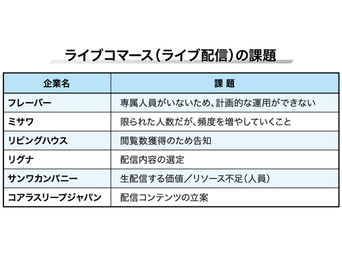 本紙はこのほど、住設やインテリアのEC事業者にライブコマースやライブ配信への取り組み状況を調査した。回答のあった9社はともに20年3月以降から開始しており、ECへのコンバージョン率に手応えを感じている一方で、人材、配信時間、内容、事前告知などに課題を感じている事業者も多かった。取り組んでいく中でノウハウの蓄積を目指しており、配信側と視聴者との一体感がCVを高める一つの要因になっている。