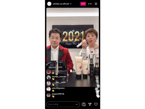 高級美容機器や化粧品のEC事業を手掛けるARTISTIC&CO.(アーティスティックアンドシーオー、本社岐阜県、近藤英樹社長)は、20年12月31日から21年1月1日にかけて実施したライブコマースを契機にECの売り上げが拡大している。ライブコマースの配信中と、配信後の2月1日までのEC売り上げは累計約3500万円を超えた。