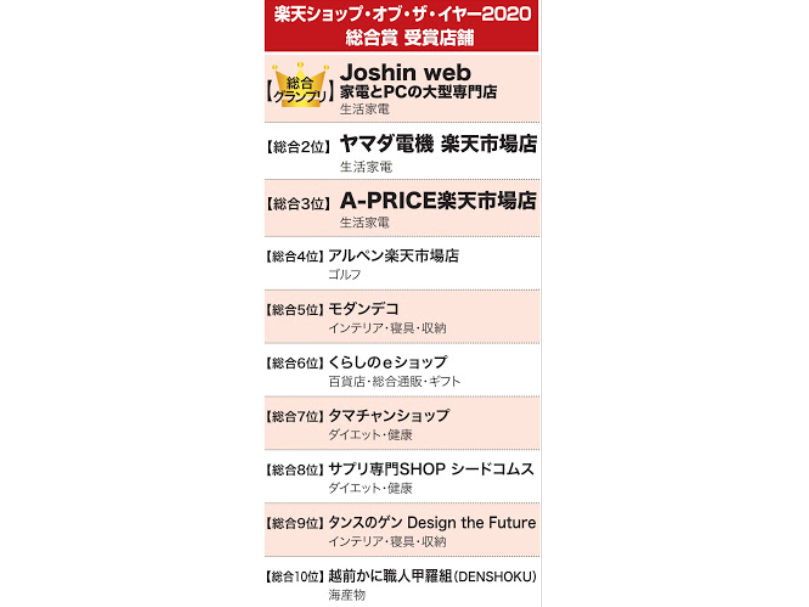 総合賞の1~3位は家電量販店が占めた。総合グランプリの「Joshin web 家電とPCの大型専門店」をはじめ、上位店は高まる巣ごもり需要に応える在庫を確保し、単価が高い家電製品を効果的に販売することができた。