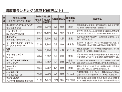 年商10億円以上の増収率ランキングでは、前年比130・8%増を達成したオールアバウトライフマーケティングが1位にランクインした。飲料や食品・日用品を中心に扱っている同社は15年3月期に取り扱い商品数を前期比135%増の891品目にまで拡充した。さらに、14年7月には酒類免許を持つシャンディーを買収し、酒類の取り扱いにも着手した。
