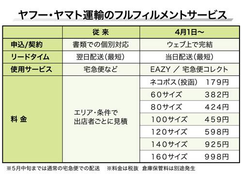 ヤフー(本社東京都、川邊健太郎社長)は3月10日、ヤマト運輸(本社東京都、栗栖利蔵社長)と協業して行う出店者向け物流代行サービスを4月1日に刷新すると発表した。配送料金を全国一律に統一。置き配や当日配送にも対応する。物流基盤を強化し、ECモールとしての優位性を確保する。