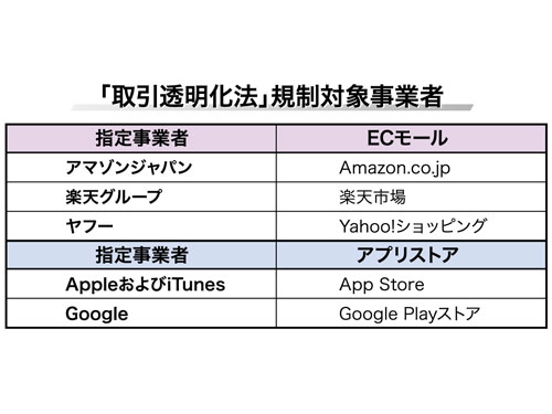 政府は4月1日、デジタルプラットフォーム(DPF)事業者に対する規制を定めた新法の対象として、楽天グループらECモール・アプリストア運営5事業者を指定した。対象事業者には、取引条件などの情報開示および自主的な環境整備を義務付ける。