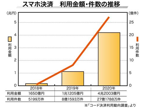 スマホ決済の市場規模は加速度的に巨大化している。一般社団法人キャッシュレス推進協議会が5月末に公表した調査結果によると、スマホ決済の20年における国内利用決済高は4兆2003億円。前年比で約3.7倍と大きな伸びを見せている。