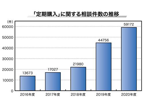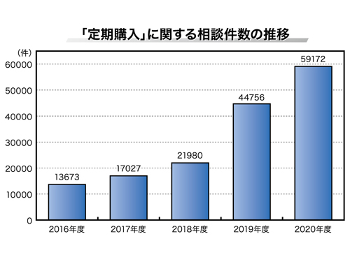 消費者庁は6月8日、21年版消費者白書を発表した。PIO―NETに登録された通販の定期購入に関する相談件数は、16年からの5年間で4.3倍に増加しており、5万9172件だったとしている。