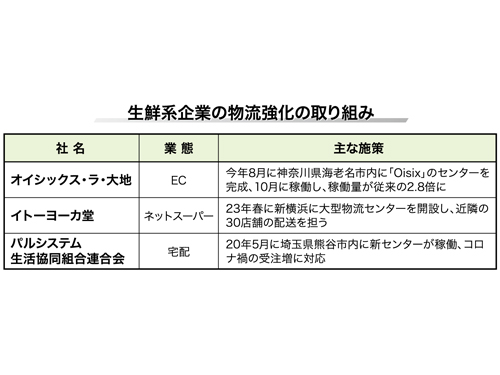 生鮮系EC・宅配企業で、物流体制を強化する動きが活発化している。各社は昨年、コロナ禍の外出自粛に伴って受注が急増。受注や新規会員登録を停止せざるを得なくなった企業もあった。今年も生鮮食品をネットで購入する傾向が続いており、物流体制の整備で対応する。オイシックス・ラ・大地は今秋をめどに新たな物流拠点を稼働し、稼働量を従来の2.8倍に8倍にする。イトーヨーカ堂のネットスーパーも23年春に新物流拠点を稼働する計画だ。安定した物流体制を構築する各社の取り組みについてまとめた。