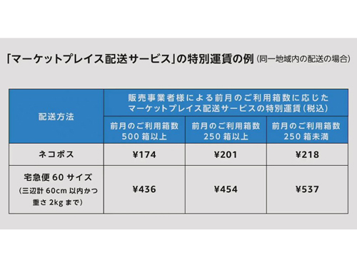 アマゾンジャパンは10月5日、ヤマト運輸と提携し、アマゾンマーケットプレイス出品事業者で自社出荷を行う事業者に対して、特別運賃で出荷・配送できるプランを提供すると発表した。特別プランでは、前月の利用箱数に応じて料金が決まる。60サイズの商品を1箱436円で配送できるケースもある(表を参照)。21年12月末までの提供開始を目指すとしている。