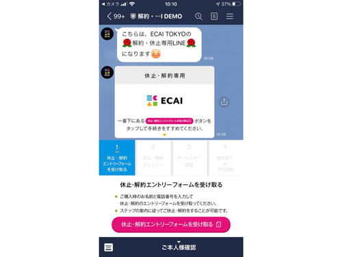 同ツールでは、健康食品や化粧品などの定期購入契約をした際に、顧客にブランドのLINE公式アカウントに友達登録してもらう。ブランドと顧客がLINEを通じて、コミュニケーションを図ることもできる。顧客が定期通販を解約する際には、LINEアプリ上で解約申し込みの専用ページに遷移してもらい、解約理由に関するアンケートに回答してもらうという。