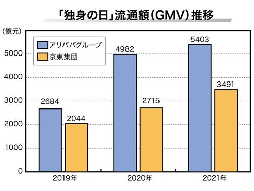 セールイベント期間は、「独身の日」当日を終点に近年長期化している。「天猫ダブルイレブン」は昨年から、11月1日~11日をGMV集計期間とし、それに伴い20年のGMVは前年比85.2%増と大幅に拡大した。