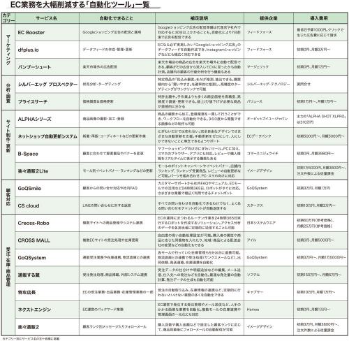 EC企業の業務を大幅に削減する自動化ツールが増えている。受注処理や在庫管理を自動化できる一元管理システムは増えているが、最近では顧客対応やマーケティングまで自動化できるサービスが登場している。自動化ツールを駆使することで、業務負担を減らし、人にしかできない業務にスタッフを集中させることが可能だ。