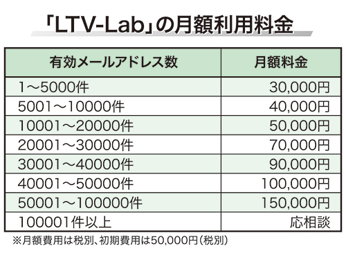 「LTV―Lab」は、カートシステムと連動して顧客にメール配信/ステップメール配信ができるCRMシステム。購入商品や金額、購入期間などから顧客をセグメントして、最適な顧客にメール配信やステップメール配信(無制限)ができる。