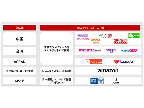 中国やロシアに加えて、東南アジアで強みのある「Lazada(ラザダ)」「Shopee(ショッピー)」での販売支援体制も構築している。今後、さらに販売できる国や販売チャネルを広げる予定だ。