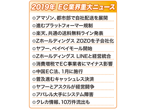 大手ECプラットフォームの動きが活発な1年だった。ZホールディングスのZOZO(ゾゾ)買収やLINEとの経営統合は、ECモールの競争をさらに過熱させる。アマゾンや楽天の配送サービス関連の取り組みは、20年にその成否が現れそうだ。プラットフォーマー新法制定に向けた動きからも目が離せない。19年の取り組みを振り返り、20年の戦略立案に役立ててほしい。