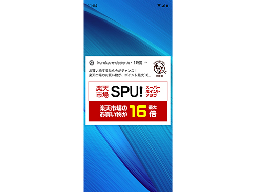 広告コミュニケーションツール「Re:Dealer(リ・ディーラー)」は、顧客の端末にプッシュ通知を配信するシステム。ブラウザー経由で楽天市場の店舗に訪れた顧客に対して、プッシュ通知配信の同意を得て、店舗が設定するタイミングで通知を配信する。あらかじめ配信先をセグメントして情報発信できる点がメリットだ。通知経由でCVに至った売り上げのうち一部を料金として徴収。自社ECサイトに導入することも可能となっている。