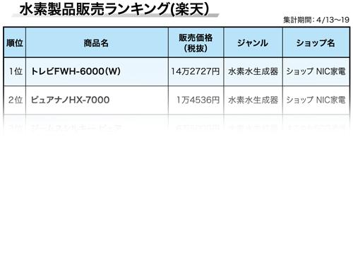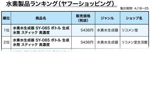 楽天市場の売れ筋ランキング(4月下旬発表)では、上位10品目のうち、水素水生成器が7品目、ヤフーショッピングのランキング(4月下旬発表)でも上位10品目中、6品目を占めた。