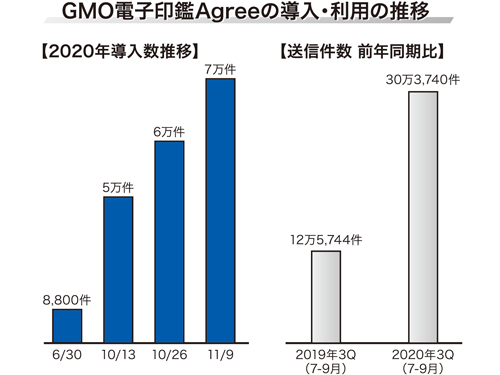 GMOグローバルサイン・ホールディングス(GSHD)では、電子契約サービス「GMO電子印鑑Agree」のアカウント数が20年11月8日に7万件を突破した。