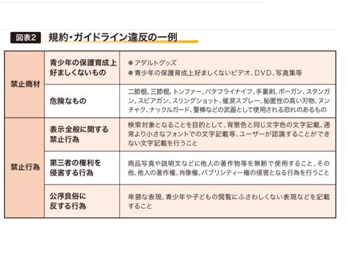 これまでも、禁止商材や禁止行為(=図表2)を規約・ガイドラインで規定し、販売を禁止している商材の販売や禁止行為で退店措置となった店舗もあった。これまで楽天は出店規約のほかに、さまざまなガイドラインを出してきたが、何が違反行為であるかをより明確に開示していくというものだ。