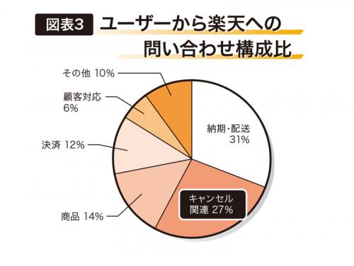 図表3にあるように、現在、楽天への問い合わせは納期のほか、キャンセル・注文内容の変更・返品が上位を占めている。この結果を受け、楽天は「キャンセル・返品・交換の推奨」を提言していく。