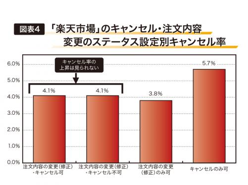「楽天市場」で調査しても、「キャンセルも注文内容の変更もできない」「注文内容の変更だけできる」「キャンセルだけできる」「キャンセルも注文内容の変更も受け付ける」の設定ごとにキャンセル率を調べたが、キャンセル率はほぼ変わらなかった(=図表4)。