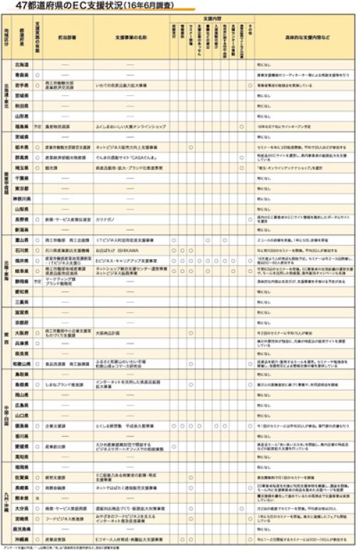 本紙ではこのほど、47都道府県にアンケート調査を実施、各都道府県のEC支援の実施状況を一覧表にまとめた(表1)。調査の結果、19自治体がEC支援事業を展開しており、2自治体が外部団体に委託する形で支援を実施していることが分かった。今後支援事業を開始する予定の自治体も二つあった。