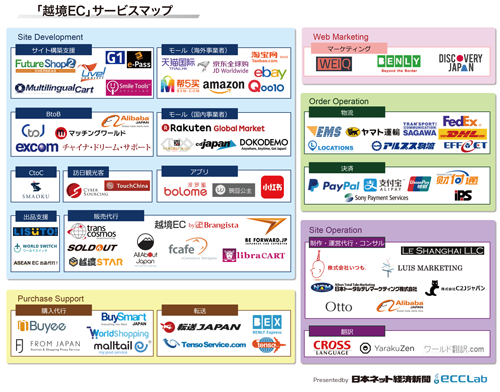 越境EC市場が拡大しつつある。大手から中小まで越境ECに参入する事業者は後を絶たない。転送サービスなどを利用して手軽に対応を開始する事業者もいれば、海外のECモールに出店し本格的にEC事業に着手する事業者もある。国内向けとは勝手が違う越境ECに取り組むためにはパートナー選びが重要だ。「日本ネット経済新聞」と、EC業界のキュレーションメディア「eccLab」が共同制作した「越境ECサービスマップ」を参考にしてほしい。