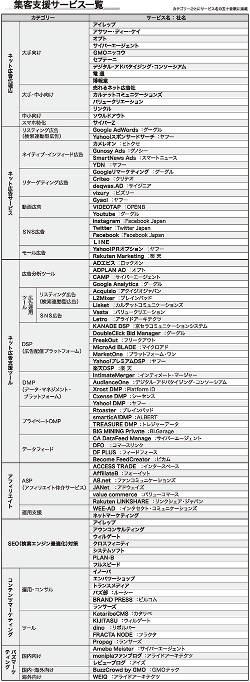 ECサイトの集客支援のためのサービスが多岐にわたっている。リスティング(検索連動型)広告やモール広告をはじめ、ディスプレー広告、ネイティブ(記事型)広告、動画広告、SNS広告などネット広告は広がりを見せている。配信方法も一度サイトに訪問したユーザーに再来訪を促す「リターゲティング広告」や、提携メディアの広告枠に配信できる「DSP」を活用する方法もある。SEO(検索エンジン最適化)対策として注目が高まるコンテンツマーケティング支援サービスも増えている。ECのウェブメディア「eccLab」と共同で、EC事業者が活用できる主要な集客支援サービスをまとめた。