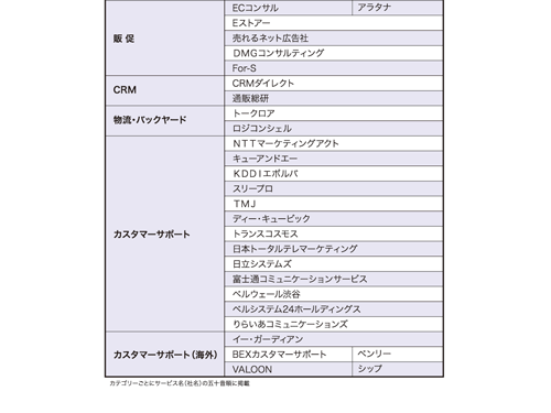 EC事業の拡大を支援するコンサルティング(コンサル)企業や、サイト運営業務を代行する企業を、ECのネットメディア「eccLab」と共同でまとめた。総合的にEC支援を行う企業は、対象となる事業者の規模ごとに分類している。得意分野を持つコンサル企業は「販促」「CRM」「物流・バックヤード」などカテゴリー分けした。EC企業のカスタマーサポートを代行する大手コールセンター事業者もまとめている。
