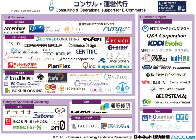 EC事業の拡大を支援するコンサルティング(コンサル)企業や、サイト運営業務を代行する企業を、ECのネットメディア「eコマースコンバージョンラボ(eccLab)」と共同でまとめた。総合的にEC支援を行う企業は、対象となる事業者の規模ごとに分類している。越境ECやECモールの運営支援に強みを持つ企業もある。サービス分野に特化したコンサル企業は、「販促」「CRM」「物流・バックヤード」などに分けた。EC企業のカスタマーサポートを代行する大手コールセンター事業者もまとめている。